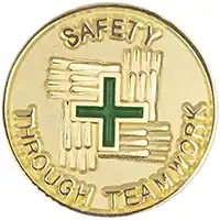 Celebrate teamwork and safety with our exquisite Safety Through Teamwork Pin. Ideal as safety award pins for employees or as safety awards for companies. 3/4 inches, gold-plated with a post & clutch pin back.