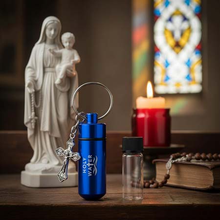- Features a tiny glass 2 ml vial secured inside a sleek metal container with the words Holy Water on the side