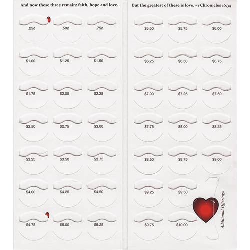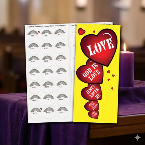 Elevate your church fundraising efforts with our $10 Love Quarter Coin Folders for Church Fundraising. Designed to inspire generosity, these charming folders feature red hearts adorned with uplifting Christian messages of love, making them perfect for various initiatives such as food drives, missions, and community development projects. Each church coin folder holds 40 quarters and includes an additional offering slot for bills or checks, simplifying the donation process. Packaged in sets of 50, they fit seamlessly into #10 envelopes for easy mailing, ensuring outreach to those unable to attend services. Made in the USA, these church gleaners are an effective and engaging tool for fundraisers for church youth groups and Sunday school giving.