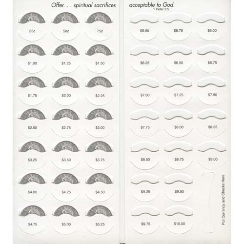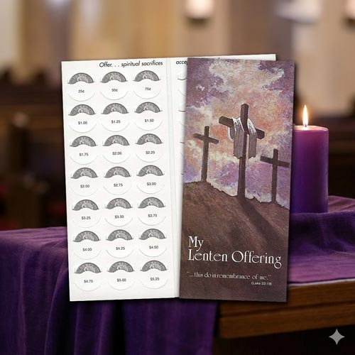 Elevate your Lent sacrificial giving with our $10 Calvary Crosses Lenten Quarter Folders. Each beautifully crafted folder features stunning hand-drawn artwork of the three crosses of Calvary, along with the inspiring title "My Lenten Offering" and the scripture quote from Luke 22:19 on the front cover. The back cover showcases a crown of thorns and includes powerful scripture quotes from John 3:16 and Isaiah 53:4, along with space for your name, address, and number. Designed to hold 40 quarters, these Lenten coin folders are perfect for encouraging sacrificial offering during the Lenten season. Sold in a convenient package of 50, each folded coin folder fits perfectly into a #10 envelope, making it easy to share with those unable to attend services or events in person.