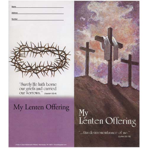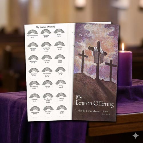 Elevate your Lent sacrificial giving with our $10 - 3 Crosses Lenten Quarter Folders. Each beautifully crafted folder features stunning artwork of the three crosses of Calvary, along with the inspiring title "My Lenten Offering" and the scripture quote from Luke 22:19 on the front cover. The back cover includes a crown of thorns, the powerful scripture quote from Isaiah 53:4, along with space for your name, address, and number. Designed to hold 40 quarters, with semi-dated quarter slots showing the days of the week, these Lenten coin folders are perfect for encouraging sacrificial offering during the Lenten season. Sold in a convenient package of 50, each folded coin folder fits perfectly into a #10 envelope, making it easy to share with those unable to attend services or events in person.