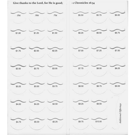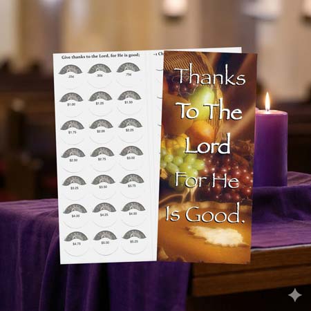 Elevate your church fundraising efforts with the $10 Thanks to the Lord For He Is Good Quarter Coin Folders. Featuring a festive fall harvest image, these beautifully designed quarter gleaners inspire faith and thankfulness while enhancing church offerings. Each church coin folder includes slots for 40 quarters and an additional slot for bills or checks, making it easy to collect donations. The back cover showcases a cross and the uplifting Ephesians 5:20 (KJV) scripture, along with space for labels or personal addresses. Packaged in sets of 50, these convenient folders fit perfectly into #10 envelopes for easy mailing, ideal for outreach to those unable to attend services. Proudly made in the USA, they are a meaningful addition to your church's fundraising initiatives.