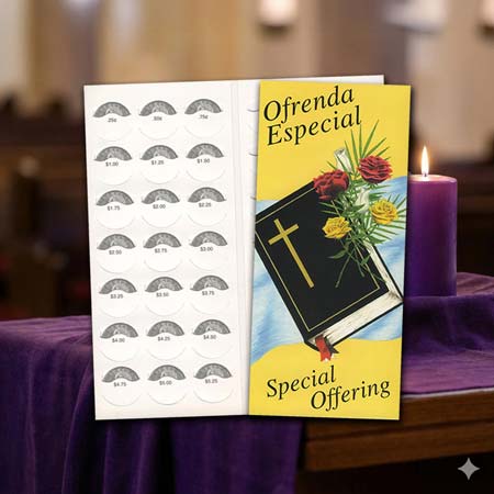 Elevate your fundraising efforts with our $10 Ofrenda Especial Quarter Coin Folders, designed specifically for churches serving both Spanish and English-speaking congregations. These Special Offering church coin gleaners feature the inspiring Corinthians 9:6-7 (NIV) scripture quote, beautifully presented alongside stunning artwork of a Bible, roses, and a white shroud against a vibrant yellow background. Each folder holds 40 quarters and includes an additional slot for bills or checks, making them versatile quarter coin folders for fundraising. Sold in convenient packages of 50, these folded quarter gleaners fit perfectly into a #10 envelope for easy mailing with a USPS first-class stamp, ensuring seamless distribution for your church's fundraising initiatives.