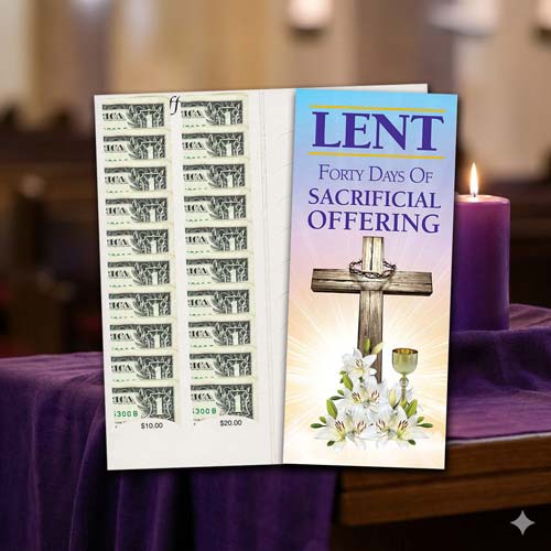 Embrace the spirit of sacrifice this Lenten season with our $40 Sacrificial Offering Lenten Gleaners. Designed as a meaningful way to give up for Lent, these Lent offering folders are a dollar version of traditional Lenten quarter folders, featuring stunning artwork of a cross, thorny crown, chalice, and lilies. Each folder includes 40 slots for a dollar bill, allowing you to reflect on Jesus' sacrifice daily. The back cover beautifully explains the powerful symbolism behind His command, "This do in remembrance of me," making it a perfect tool for your Lenten offering journey. Join in the act of giving and deepen your faith with this inspiring sacrificial offering. One folded Coin Folder fits nicely into a #11 envelope and can be mailed out with a USPS first class stamp (stamps not included).