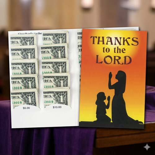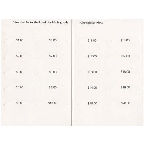 Elevate your church fundraising efforts with the $20 Thanks to the Lord Church Gleaners. Featuring a touching silhouette of a young girl and her mother in prayer, this beautifully designed gleaner not only inspires faith but also enhances church offerings. Each gleaner includes slots for 20 dollar bills, making it a perfect alternative to traditional quarter coin folders. The back cover showcases the uplifting Ephesians 5:20 (KJV) scripture and provides space for labels or personal addresses. Packaged in sets of 50, these gleaners fit conveniently into A-6 envelopes for easy mailing, making it ideal for outreach to those unable to attend services. Proudly made in the USA, they are a meaningful addition to your church's fundraising initiatives.
