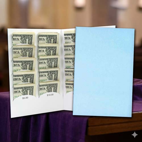 Elevate your fundraising efforts with our $20 Blank Blue Dollar Bill Fundraising Gleaners, works the same as quarter gleaners, but with dollar bills. Designed to hold up to 20 dollar bills, making them perfect for church fundraisers, charities, non-profit organizations, scouting troops, and youth sports teams. With no text inside except for the dollar amounts, you can easily customize them by printing labels with your organization’s name, logo, and fundraising details. Sold in a convenient package of 50, these folded gleaners fit perfectly into a A-6 envelope, ensuring easy distribution. Available with or without envelopes, they are the ideal fundraising supplies for any language, denomination, charity or non-profit initiative.