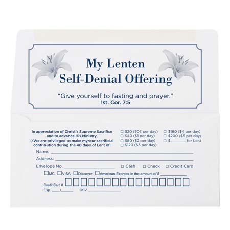 Introducing our Deluxe My Lenten Offering Envelopes for churches, designed to enhance your church's giving experience. This beautifully crafted envelope showcases the 3 crosses of Calvary and white lilies, symbolizing the spirit of Lent. With double-sided printing on all four panels, these Lent envelopes are not only visually appealing but also practical. Measuring 3 1/2 x 6 1/2 inches when folded, they provide ample space for hidden credit card or large offering information. Mailing these envelopes is a breeze, making it convenient for your congregation. Each box contains 500 Lent church contribution envelopes, ensuring a sufficient supply for your church's needs. Must-have church supplies for the Lent season. Perfect church contribution envelopes for Lent and Easter.