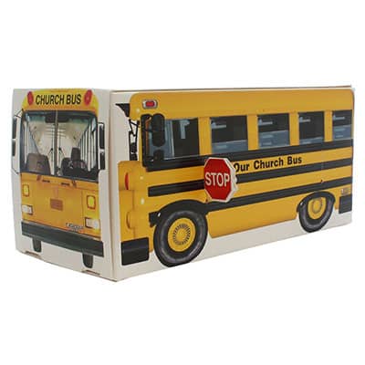 10 Larger, 4 color Yellow Cardboard Church Bus Donation Bank. 5 1/2 x 2 1/2 x 2 1/2 inches Sunday School bus box. Die cut glued sturdy cardboard bus with a coin slot. This is a strongly designed box and is easy to assemble. Unique features: Stop sign perforates out and inserts into the side of the bus. Church or persons name signs can be written on and attached to sides. Great to raise money for bus ministry, bus expenses or travel team. Ships flat. Space to write name on bottom of bus. In stock ready to ship to your ministry! Sold in Packages of 10 Boxes