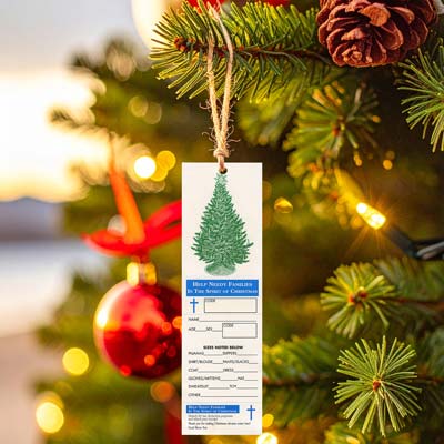 Spirit of Christmas Angel Tree Tags are a wonderful way to bring Christmas to those in need. Perfect for adults or children. Each Angel tag is 3 X 10 1/2 inches, printed on coated card stock, pre-perforated with a hole punched for hanging on a Christmas tree. There’s places for information about the person gifts go to, including size, sex and what is needed, and a spot for a name. Can be used by any retirement home, non-profit, business, organization or church. Comes in a package of 100. Designed to be hung on Christmas tree in November and early December. Anonymous giving Christmas angel tree giving tags are an exciting way to give to those who need it the most.