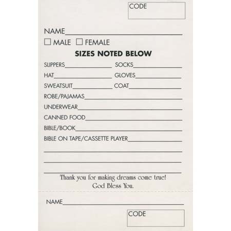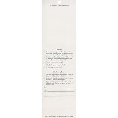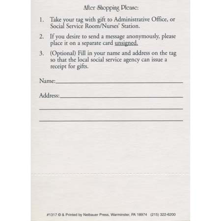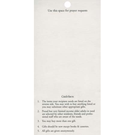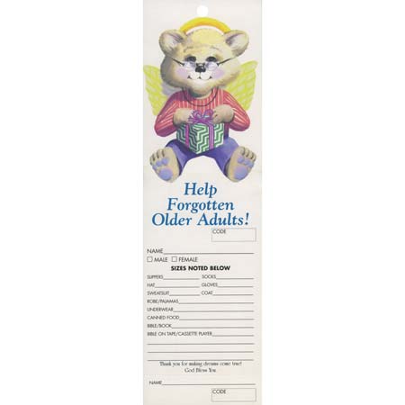 Bring joy to those who need it most this holiday season with our Help Forgotten Older Adults Christmas Angel Tree Tags. Each beautifully designed angel tag features a charming bear holding a gift, symbolizing the spirit of giving. Measuring 3 x 10 1/2 inches and printed on durable coated card stock, these giving tree tags are perfect for hanging on Christmas trees in retirement homes, non-profits, businesses, organizations, or churches. Each tag includes space for essential recipient information, making it easy to fulfill their needs. Available in a convenient package of 100, these anonymous giving Christmas angel tree tags for seniors are a heartfelt way to spread holiday cheer and ensure that no senior is forgotten this Christmas.