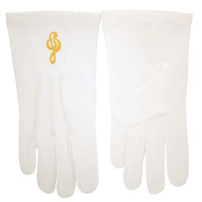 Classic white formal gloves embroidered with a 1 1/4 inch, gold G Clef. Unisex for men and women. Lightweight, made from 100% cotton and economical. These music gloves are perfect as marching band gloves, choir gloves and more. A nice touch for special occasions. Available in men's sizes large, xlarge and xxl.