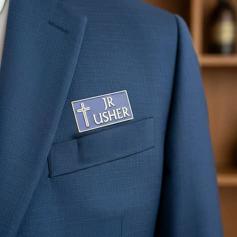 Enhance your church's welcoming atmosphere with our Junior Usher Pins. Measuring 1 x 2 inches, these badges feature a striking gold border and cross along with the title "JR USHER," making them a perfect addition to your church supplies. Crafted from a lightweight gold-plated metal alloy with a vibrant blue enamel fill, these junior usher pins for church are available with a heavy-duty magnetic backing or a dual post with butterfly clutch for secure attachment. Elevate your junior ushers' presence with this distinguished Jr Usher badge, combining style and functionality.