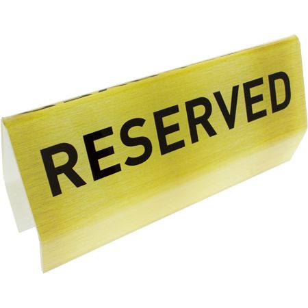 Reserved Signs brushed Gold Lucite Plastic. 3 x 6 inches. Printed Reserved front and back marker sign to reserve seating. Reserved sign. Plastic. Please order in 2's, that is the way they are prepacked. Opening 1 inch, works for folding chairs and thin back chairs.