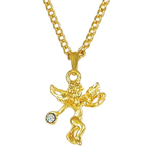 Beautiful petite gold cherub angel has a clear sparkling brilliant CZ stone. This lovely pendant measures 3/4 inches including bail. Includes 18 inch gold light curb link necklace, and has a spring ring clasp. Suitable for youth or adults