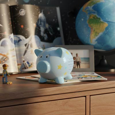 Blue ceramic Piggy bank with removable plug in bottom. The blue piggy bank measures a cavernous 5 x 4 inches. Perfect for a baby boy gift or collection bank. Bank includes a guardian angel quote on the side of the bank. 'For I know the plans I have for you, declares the LORD' Jeremiah 29.11