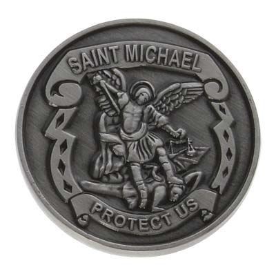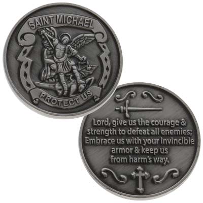 St. Michael Coin Token for military servicemen or woman, police Pewter. Keep us from harms way. This beautiful St. Michael coin is about the size of a silver dollar 1 1/8 inch. No shine on coin. They are handsomely engraved pewter oxidized metal with detailed images of the saint Michael on one side, and prayers to St. Michael "keep us out of harms way" on the opposite side with cross and sword. Carry along in your pocket or purse! Finely detailed. Protector against all evil. St. Michael the Archangel – against danger at sea, against temptations, holy death, sick people, storms at sea.