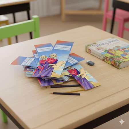 10 Commandments Bookmarks feature a picture of Moses and an Exodus 20 scripture reference. Each Ten Commandments bookmark is 2 x 7 inches, printed on heavy card stock and come in shrink-wrapped packages of 25. Easy to read christian bookmarks. These religious bookmarks make nice christian gifts. Perfect as bible bookmarks and ideal to give these religious gifts as church gifts, bible study gifts, Sunday School Gifts or christian Christmas gifts. Exclusive design by Sterling Gifts.