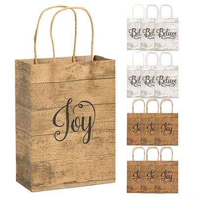 Religious kraft paper gift bags featuring a stylish weathered and reclaimed wood look, they're printed with the words 'Joy' and 'Believe'. With these holiday gift bags on hand, you’ll never again be caught unprepared when it’s the season of giving! These versatile gift bags are perfect for year-round gift-giving. These stylish gift bags are sure to make your present stand out from the pack. Just add some tissue paper for a beautiful gift presentation!Give your religious gifts a rustic chic look with these kraft paper bags. Ideal as Christmas gift bags, as treat bags for Sunday School parties, and for gifts for First Communion, Confirmation, and baptisms. Each Inspirational gift bag measures 6 1/2 x 3 1/4 x 9 inches and sold as assorted only.