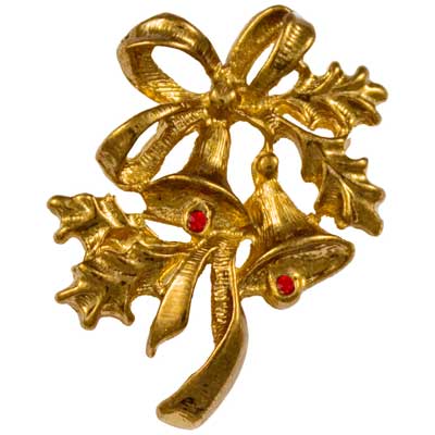 Add a touch of festive elegance to your holiday attire with our Antique Gold Bow, Bells and Holly Christmas Pin. This exquisite Christmas brooch pin measures 3/4 inch wide by 1 inch tall and features a beautifully crafted gold bow complemented by charming holly and two delightful bells adorned with vibrant red rhinestone accents. Perfect for any Christmas jewelry collection, this stunning piece makes a wonderful Christmas gift or a lovely treat for yourself. Elevate your holiday style with this enchanting Christmas brooch for women and spread the joy of the season!
