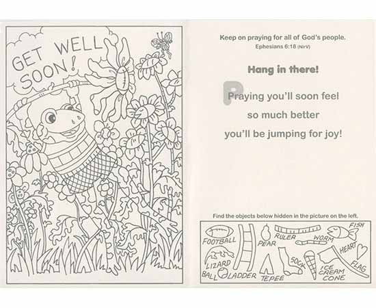 Send fun get well wishes with this box of Hidden Pictures greeting cards. Each card features a colorable replica of the featured image, a list of objects that are hidden within the picture, a kid friendly Christian sentiment and NIRV Scripture.