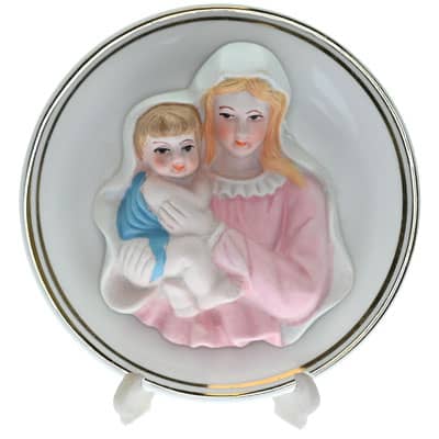 Inspirational Christmas Loving Madonna & Child Decorative Plate with Stand. 4.5 inch diameter. Boxed. Great gift for mother or family on Christmas.