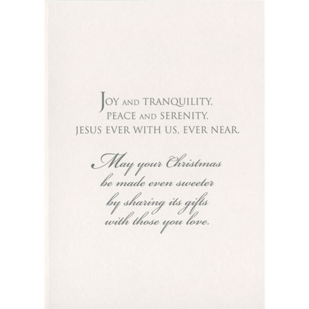 - Card Inside Greeting: "Joy and Tranquility, Peace and Serenity. Jesus Ever With Us, Ever Near. May your Christmas be made even sweeter by sharing its gifts with those you love."