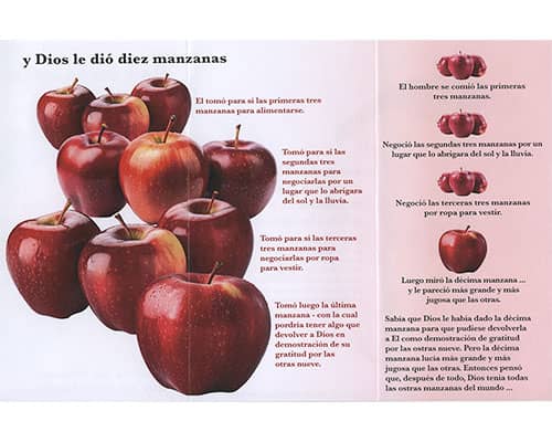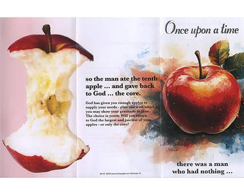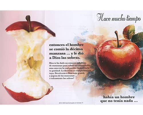 All time Best Seller! The "Once Upon a Time" Church Tithing brochure, available in a package of 50, creatively uses 10 apples to convey the important principles of stewardship, tithing, and entrusting the core to God. This 6-page pamphlet, also offered in Spanish, has seen tremendous success with over 4 million copies sold. Discover the insightful teachings on stewardship and deepen your understanding of biblical financial principles with this valuable resource. Order your copies today and share the wisdom of stewardship with your community. Over 4 million sold!