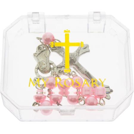 Clear Rosary Box with Gold Cross. Display and take care of any small rosary. Beautifully clean designed! This plastic hinged rosary box is 2 1/4 inches x 2 inches and over a 1/2 inch deep. A 2-pc Plastic 'My Rosary' Box keeps your rosary clean.