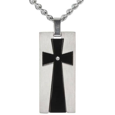 This men's black cross necklace features a striking pendant, measuring 1 1/2 inches tall, crafted from durable 316L surgical stainless steel with a sleek black resin cross inlay and rhinestone center. The black cross pendant is elegantly suspended on a 24-inch curb chain, making it a perfect accessory for any occasion. Ideal as a thoughtful gift, this black resin and stainless steel cross pendant serves as a meaningful expression of faith, making it an excellent choice among Christian gifts for men. Elevate your style with this stylish guys cross necklace that combines modern design with timeless significance.