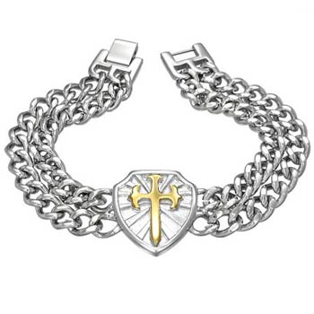 This men's stainless steel cross bracelet is a striking accessory designed for the modern man. Featuring a double row stainless steel curb chain, it showcases a distinctive 2-tone cross set against a shield, symbolizing the shield of faith. The bracelet measures 8 inches in length, making it ideal for medium to small wrists, and is secured with a reliable locking clasp. Perfect as a gift for men, this piece serves as an excellent choice for Christmas gifts for him or any special occasion, adding a touch of elegance to any outfit while embodying a meaningful statement. Comes with a black velvet gift bag.