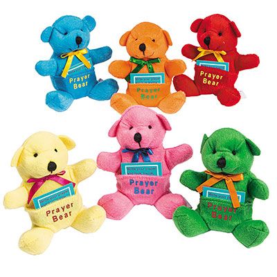 Plush bright colored prayer bears. Inexpensive 4 1/2 inches tall cuddly stuffed bear. Each with an cross on the foot, "Prayer Bear" on the tummy pocket and a small card reading "Write your prayer and tuck inside, I'll keep it safe by my side". Assorted colors only, sold individually. Small gifts children can relate to.