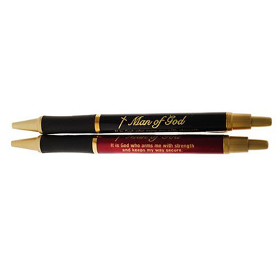 Elevate your writing experience with the Man of God Pen, a sophisticated executive pen designed for the godly man. Adorned with a Cross and the inspiring words "Man of God," this pen also features the powerful Psalm 18:32 scripture quote, "It is God who arms me with strength and keeps my way secure." Measuring a convenient 5 1/2 inches long, this retractable medium point ballpoint pen writes smoothly with black ink. Choose from elegant silver or gold metal accents and a variety of barrel colors, all complemented by a comfortable black grip. Perfect as Christian gifts for men, this pen makes an exceptional choice for Christian Father's Day gifts and church Father's Day gifts, reminding him of his faith with every stroke.
