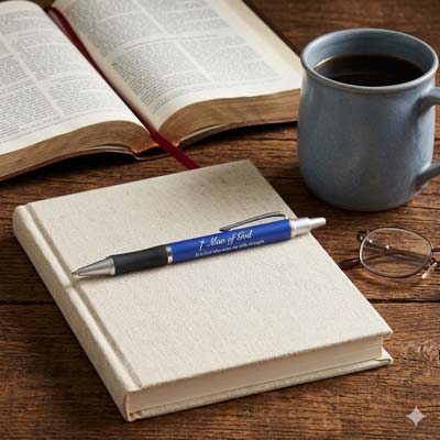 Elevate your writing experience with the Man of God Pen, a sophisticated executive pen designed for the godly man. Adorned with a Cross and the inspiring words "Man of God," this pen also features the powerful Psalm 18:32 scripture quote, "It is God who arms me with strength and keeps my way secure." Measuring a convenient 5 1/2 inches long, this retractable medium point ballpoint pen writes smoothly with black ink. Choose from elegant silver or gold metal accents and a variety of barrel colors, all complemented by a comfortable black grip. Perfect as Christian gifts for men, this pen makes an exceptional choice for Christian Father's Day gifts and church Father's Day gifts, reminding him of his faith with every stroke.
