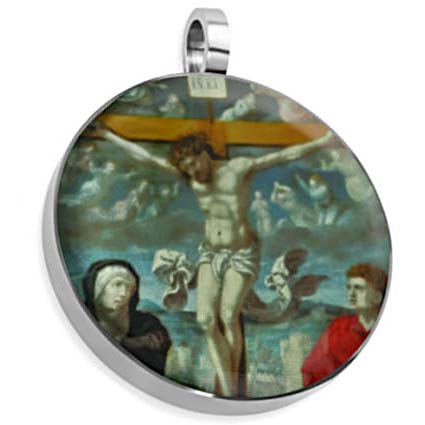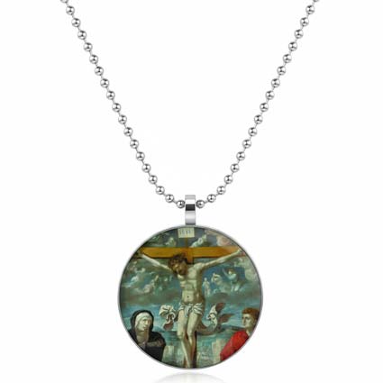 Our Jesus Necklace is a stunning piece that showcases a powerful picture of Jesus Christ on the Cross with mourning angels above him in a stormy sky, while the Virgin Mary and Saint John the Evangelist stand on either side. Crafted from durable stainless steel, the round Jesus pendant has a 1 1/8 inch diameter and comes with a 22-inch beaded stainless steel chain. The high-quality photo of Jesus is securely sealed within the pendant using a clear epoxy coating, ensuring its longevity and preserving its beauty. This Jesus medallion serves as a meaningful symbol of faith and devotion, making it a perfect gift or personal accessory for anyone seeking a constant reminder of Jesus' love and sacrifice.