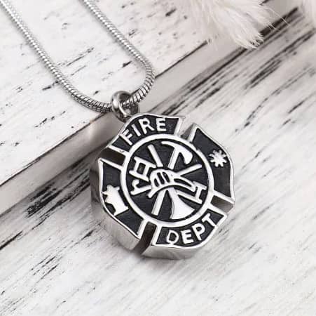 Keepsake Cremation Ashes Memorial Firefighter Maltese Cross shaped cremation urn necklace lets you keep your relative or friend close to your heart and thoughts forever. The cremation urn measures 1 3/8 inch tall, and made of stainless steel. The urn necklace comes on a 23 inch beaded stainless steel chain. Packed with an attractive drawstring bag.