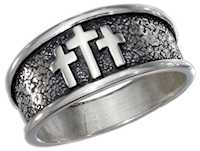 Men's .925 sterling silver wide Christian antiqued triple cross ring. Band measures 11 mm wide and tapers to 5 mm on the palm side. Packaged in a gift box. Rings are a half size small. SKU: 2411
