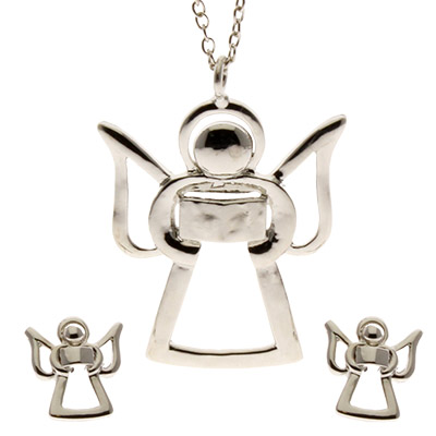 The Angel Silver Necklace and Earrings Set is a stunning addition to any jewelry collection, featuring a beautifully crafted 1 1/2 inch tall silver-tone angel pendant that exudes elegance. Accompanied by matching angel earrings, each approximately 1/2 inch tall, this set is designed to complement any outfit effortlessly. The necklace is suspended on an 18-inch silver-tone cable chain, ensuring a comfortable fit, while the earrings are secured with a post and butterfly clutch back for added convenience. This women's necklace and earring set is perfect for those seeking a harmonious and stylish accessory combination.