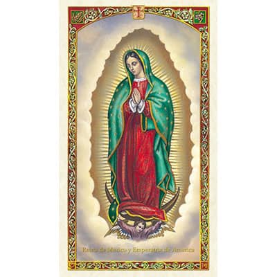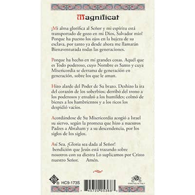 Discover the essence of humility and devotion to God by following the exemplary life of Mary through the Magnificat Laminated Prayer Card. Crafted in Italy, these prayer cards feature a stunning design that exudes inspiration and durability. The Magnificat, derived from the portrayal of the Visitation in Luke's Gospel (1:46-55), showcases the Blessed Virgin Mary's hymn of admiration towards the Lord. Emulate Mary's sincere gratitude and worship by reciting this enduring and exquisite prayer. The front of the laminated card showcases a vivid illustration of Our Lady of Guadalupe, while the back features the Magnificat, also referred to as the Canticle of Mary. Each laminated card measures 2 1/2 x 4 1/4 Card with Spanish prayer. Shown Front and Back.