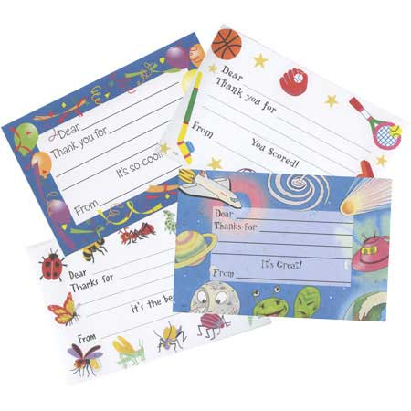 Have fun with your children when they need to send Thank You Notes? Cards ensemble includes- 12 4"x6" cards, 4 designs with 12 envelopes; 12 seal stickers & check list. card pack is an easy, FUN way for your children to thank relatives and friends for all the gifts they receive! "Thank You". Learn good manners.