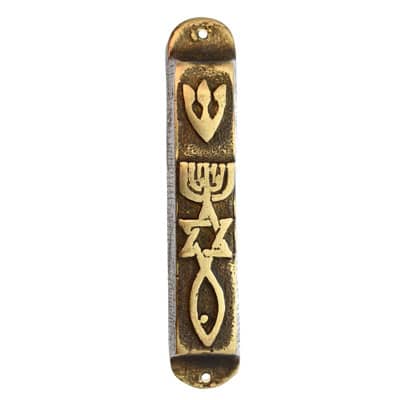 Antique Brass Mezuzah: Star of David, Christian fish, 4" high. Paper Parchment for Mezuzahs contain scriptures from the bibles, scribed, Then printed for our mezuzahs. The mezuzah has always been both for remembrance & identifying a Jewish dwelling as a place where God is honored and revered. The mezuzah is placed on the doorpost. "And you shall inscribe these words upon the doorposts of your house and upon your gates." Deuteronomy 28
